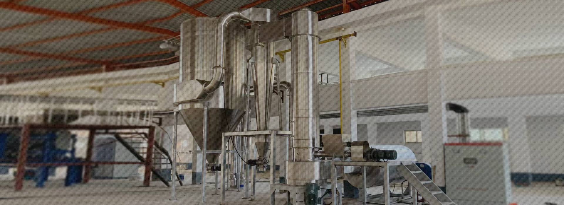 XSG系列旋轉閃蒸干燥機是由熱空氣切線進入干燥器底部,在攪拌器帶動下形成強有力的旋轉風場。膏狀物料由螺旋加料器進入干燥器內,在高速旋轉攪拌槳的強烈作用下,物料受撞擊、磨擦及剪切力的作用下得到分散,塊狀物料迅速粉碎,與熱空氣充分接觸、受熱、干燥。